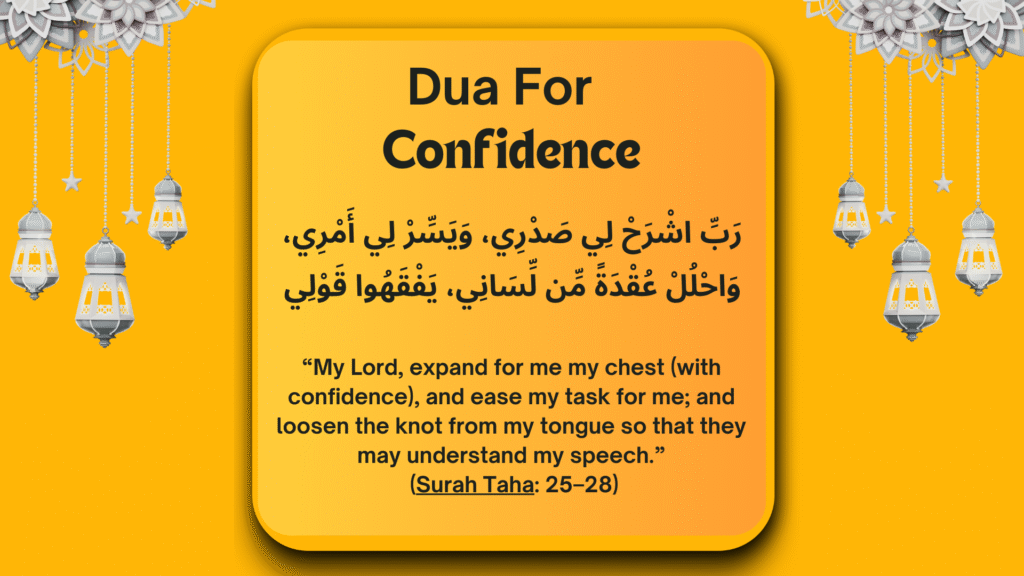 31 Aug Dua Dua for Confidence September 24, 2025 Posted by qiratequran1@gmail.com 0 comments Arabic: رَبِّ اشْرَحْ لِي صَدْرِي، وَيَسِّرْ لِي أَمْرِي، وَاحْلُلْ عُقْدَةً مِّن لِّسَانِي، يَفْقَهُوا قَوْلِي English Translation: “M... Continue reading