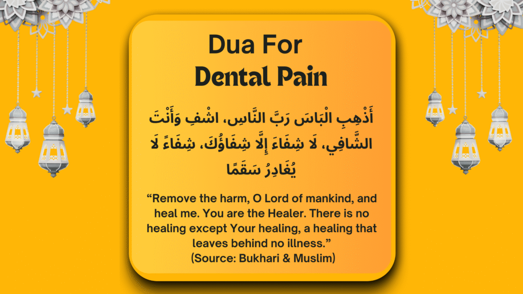 31 Aug Dua Dua for Dental Pain September 24, 2025 Posted by qiratequran1@gmail.com 0 comments Arabic: أَذْهِبِ الْبَاسَ رَبَّ النَّاسِ، اشْفِ وَأَنْتَ الشَّافِي، لَا شِفَاءَ إِلَّا شِفَاؤُكَ، شِفَاءً لَا يُغَادِرُ سَقَمًا English... Continue reading