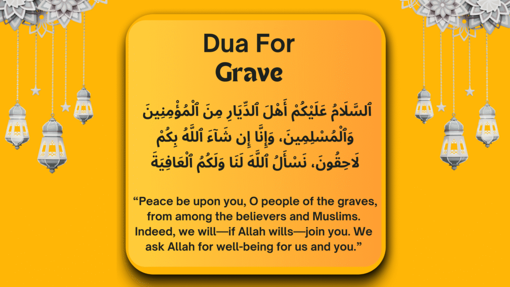 31 Aug Dua Dua for Grave September 24, 2025 Posted by qiratequran1@gmail.com 0 comments Arabic: ٱلسَّلَامُ عَلَيْكُمْ أَهْلَ ٱلدِّيَارِ مِنَ ٱلْمُؤْمِنِينَ وَٱلْمُسْلِمِينَ، وَإِنَّا إِن شَآءَ ٱللَّهُ بِكُمْ لَاحِقُون... Continue reading