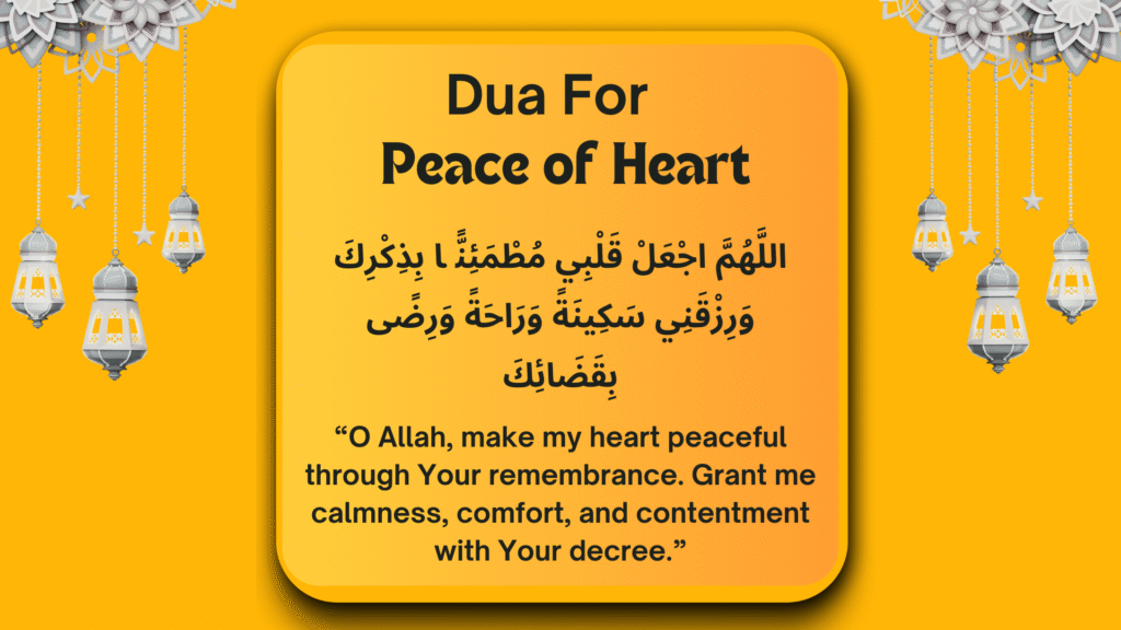 31 Aug Dua Dua for Peace of Heart September 24, 2025 Posted by qiratequran1@gmail.com 0 comments Arabic: اللَّهُمَّ اجْعَلْ قَلْبِي مُطْمَئِنًّا بِذِكْرِكَ وَرِزْقَنِي سَكِينَةً وَرَاحَةً وَرِضًى بِقَضَائِكَ English Translation: “O ... Continue reading
