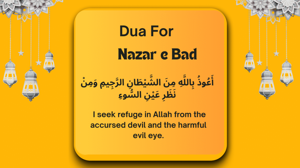 31 Aug Dua Dua for Nazar e Bad September 25, 2025 Posted by qiratequran1@gmail.com 0 comments Arabic: أَعُوذُ بِاللَّهِ مِنَ الشَّيْطَانِ الرَّجِيمِ وَمِنْ نَظَرِ عَيْنِ السُّوءِ English Translation: I seek refuge in Allah f... Continue reading